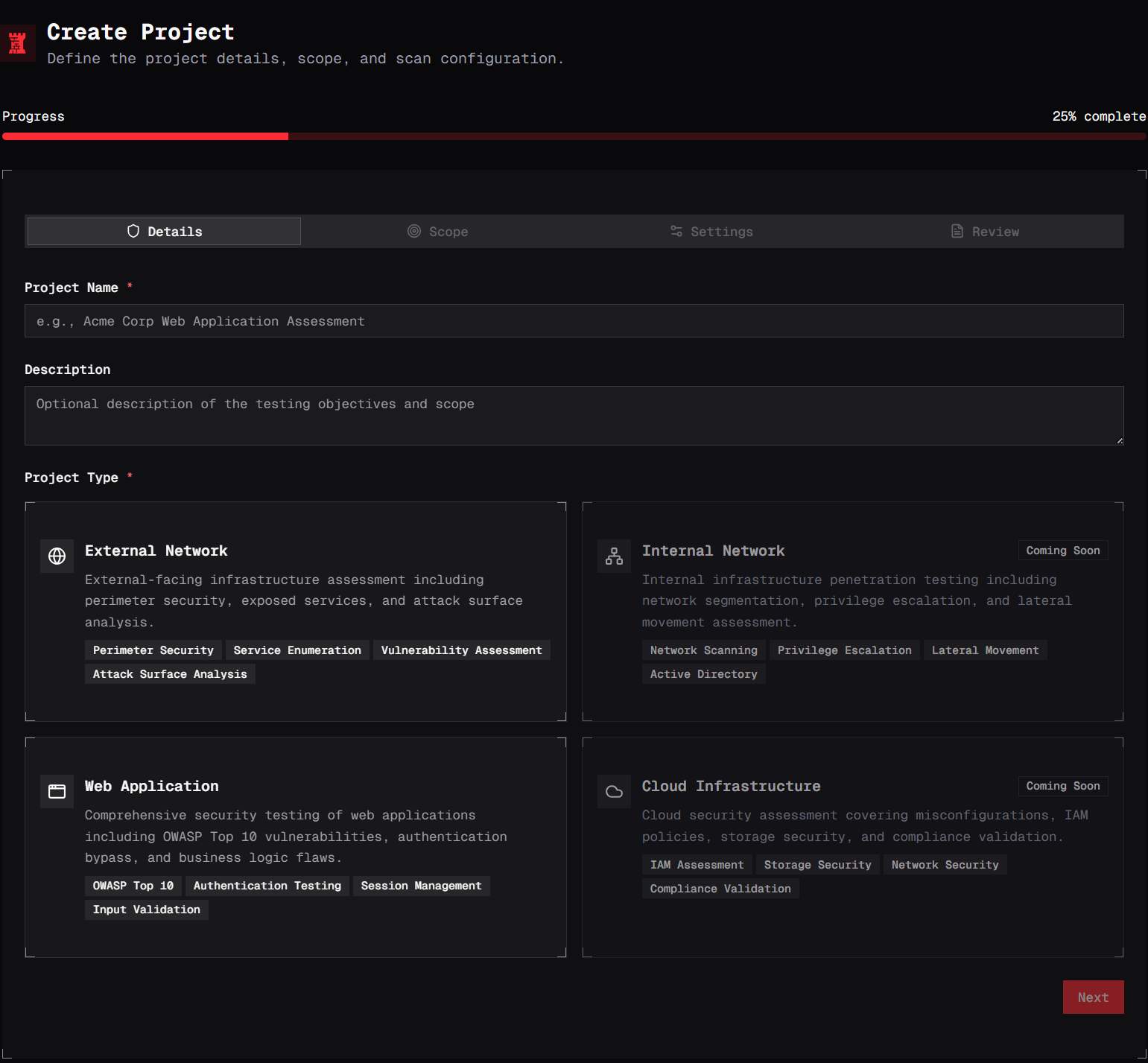 Enter a clear, descriptive name for the project. This name will be used throughout the platform to organize tests, findings, and reports.