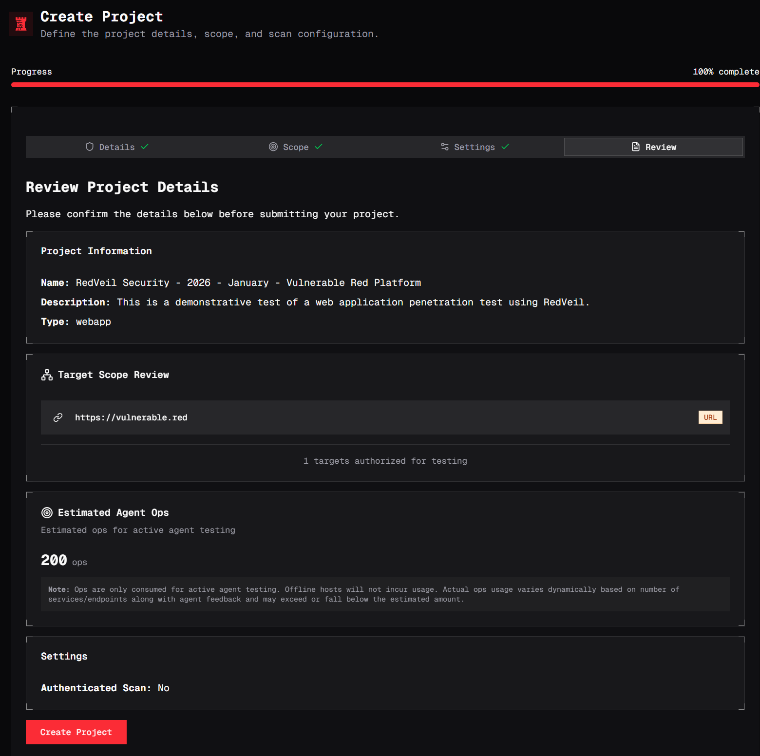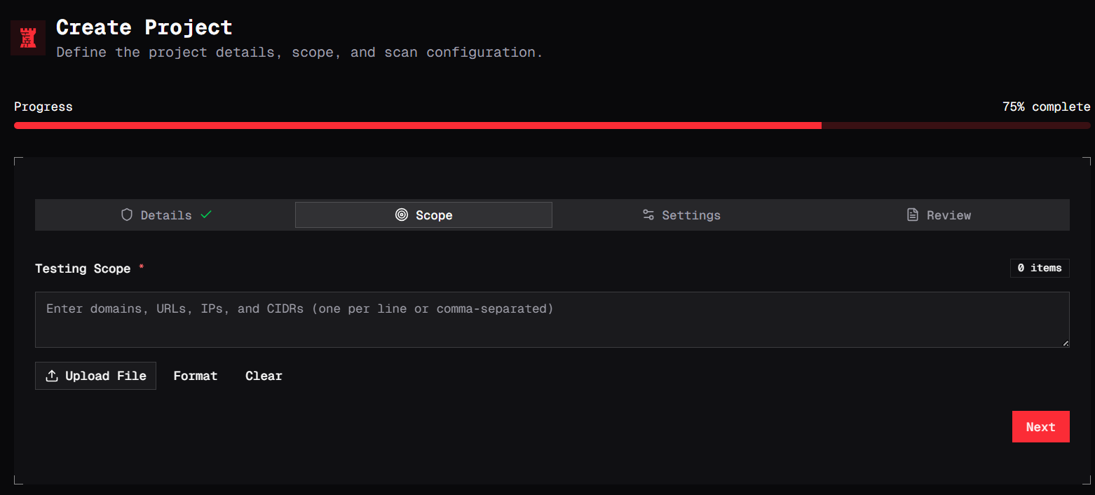 After selecting the project type, you'll be taken to the Scope step of the Create Project workflow. This is where you define exactly what RedVeil is authorized to test.