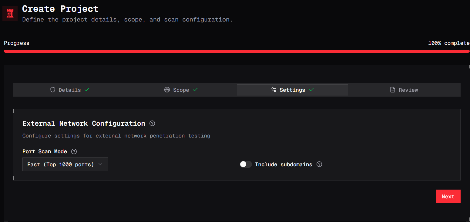 After defining the project scope, you'll move to the Settings step. This step allows you to configure how RedVeil performs testing for this project.