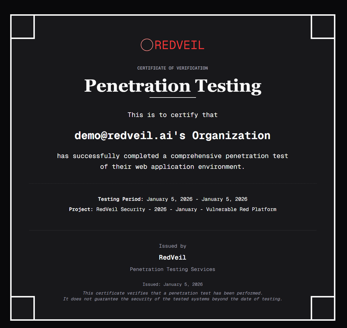 In addition to downloadable reports, RedVeil allows you to generate a public penetration testing certificate for completed projects.
