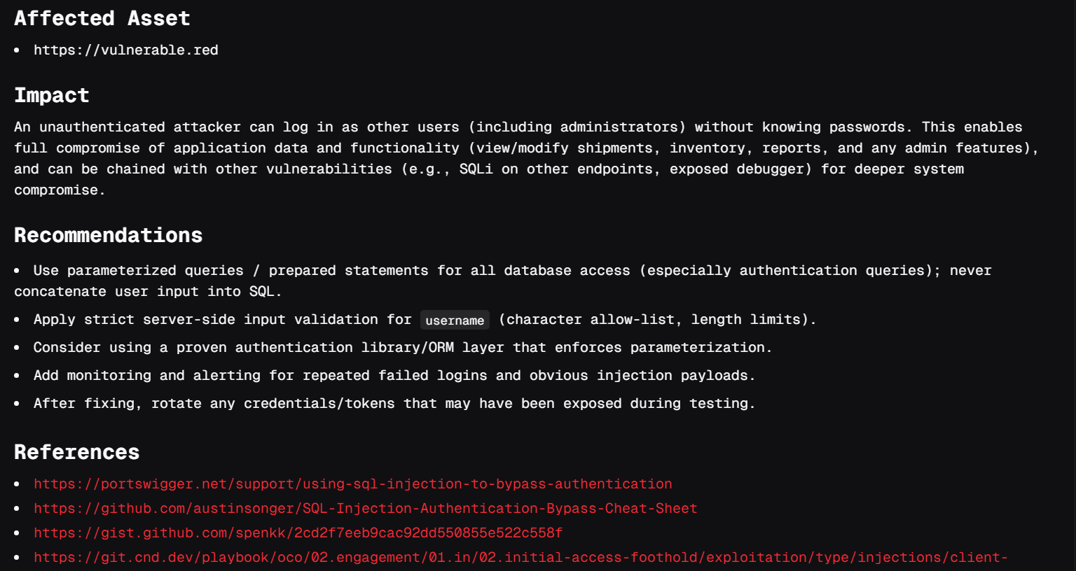 Clear reproduction steps are provided so teams can confirm behavior internally and verify fixes once remediation is applied. Findings are not based on assumptions or pattern matches alone - they are documented with observable behavior after exploitation or validation.