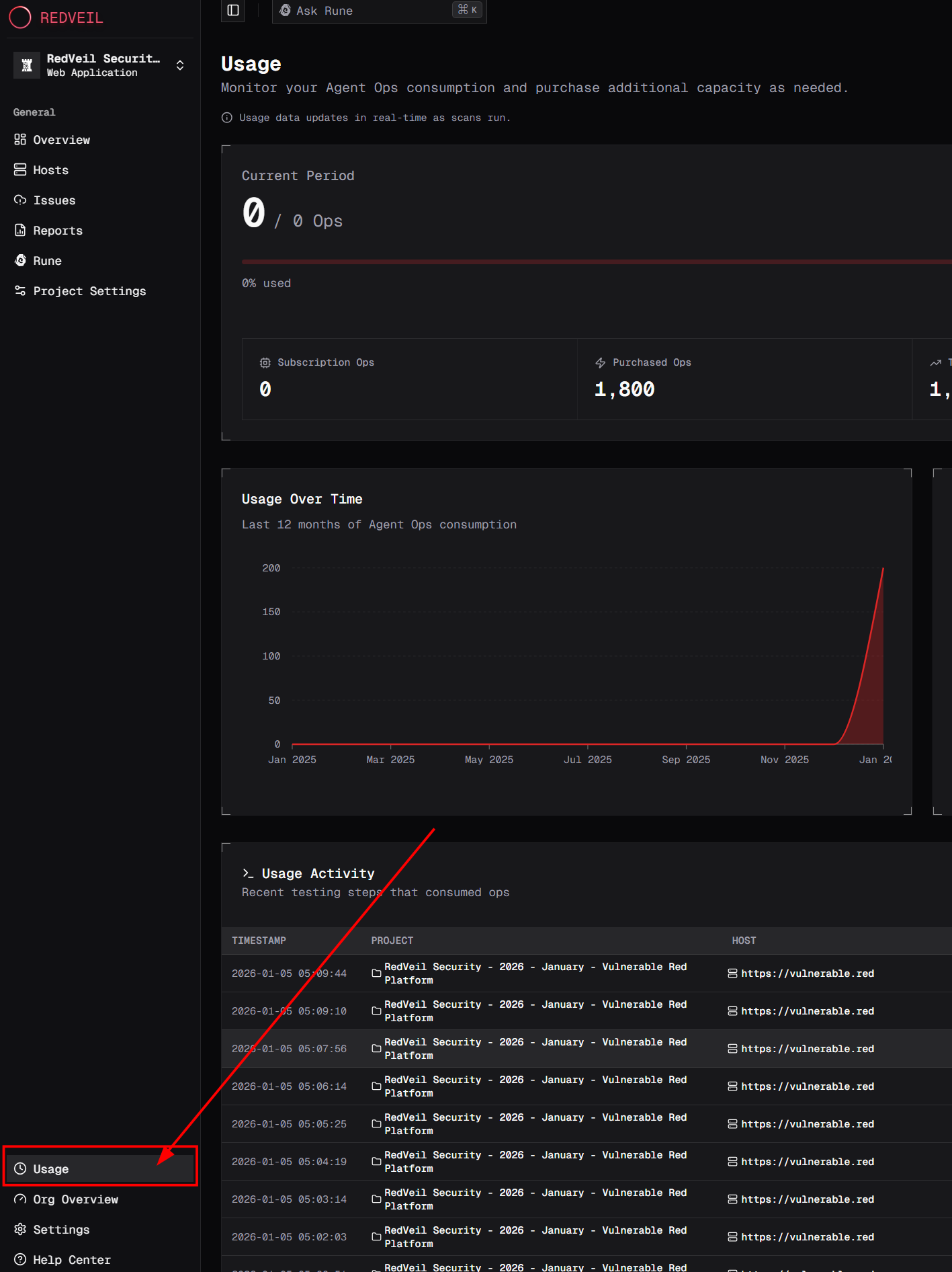 RedVeil is designed to make usage transparent and predictable. You can always see how many Agent Ops are available, how they are being consumed, and what types of tests typically use more or fewer resources.
